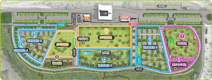 - 프리캠핑존(36면): 잔디밭에서 자유롭게 텐트를 설치하고 캠핑합니다.