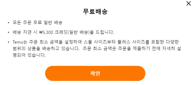 - 배송: 테무는 현재 거의 모든 주문에 대해 무료배송을 제공하고 있습니다. 주문 시 배송 예정시간보다 지연되면 5,300원의 크레디트를 받을 수 있습니다.